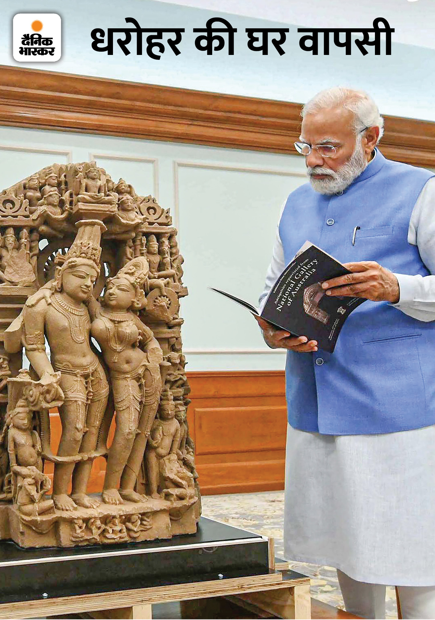 ऑस्ट्रेलिया ने 29 ऐतिहासिक कलाकृतियां भारत सरकार को सौंपी हैं। इनमें भगवान शिव, शक्ति और विष्णु की प्रतिमाएं हैं। ये सभी 9वीं-10वीं शताब्दी की हैं। बलुआ पत्थर, संगमरमर, कांसा और पीतल की बनीं मूर्तियों का नाता राजस्थान, गुजरात, मध्य प्रदेश, यूपी, तमिलनाडु, तेलंगाना और पश्चिम बंगाल से हैं। इनमें कुछ पेंटिंग भी हैं। PM मोदी ने इन्हें देखा और ऑस्ट्रेलियाई PM को शुक्रिया कहा।