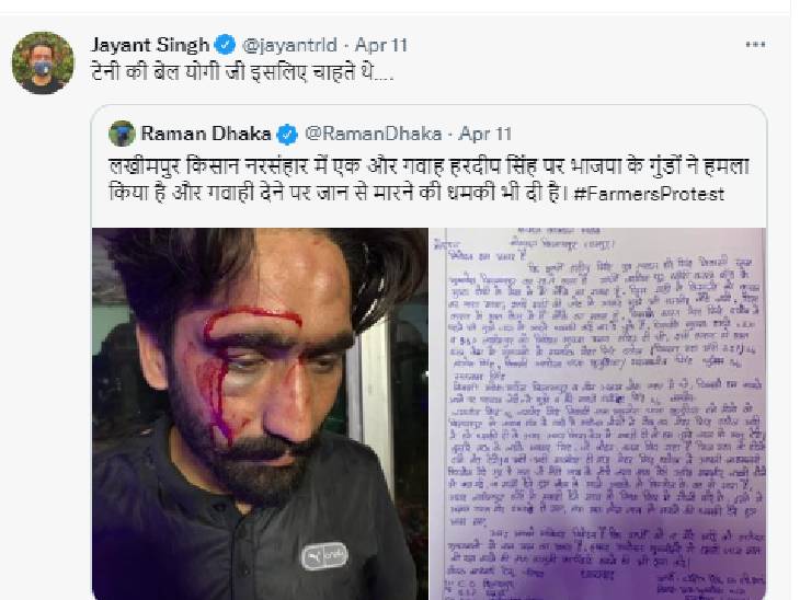रामपुर में लखीमपुर खीरी कांड के मुख्य गवाह हरदीप सिंह पर जानलेवा हमले का मामला उलझ गया है। इस घटना को एक तरफ पुलिस सड़क हादसा बता रही है, वहीं रालोद नेता जयंत चौधरी ने ट्वीट करके कहा- इसीलिए योगी जी टेनी के बेटे की बेल चाहते थे। आरोपी BJP नेता मेहर सिंह इसे झूठा आरोप बता रहे हैं। इस मामले में भाजपा नेता समेत 2 नामजद और तीन अज्ञात लोगों पर आरोप लगाया गया है।