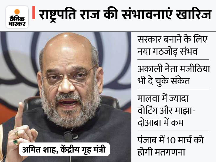 Hindi NewsLocalPunjabAmit Shah Punjab | Home Minister Amit Shah On BJP Punjab Alliance And President’s Ruleचंडीगढ़एक घंटा पहलेकॉपी लिंकपंजाब में अगर हंग असेंबली की नौबत आई तो 2-3 दल गठबंधन कर सरकार बना सकते हैं, यह दावा केंद्रीय गृह मंत्री अमित शाह ने किया है। इससे पहले अकाली नेता बिक्रम मजीठिया भी कह चुके हैं कि चुनाव परिणाम के बाद भाजपा से गठबंधन हो सकता है। पंजाब में मौजूदा हालात में सबसे बड़े आसार अकाली दल और भाजपा के साथ आने के हैं। जिसमें कैप्टन अमरिंदर सिंह भी साथ होंगे। हालांकि यह सब मतगणना के बाद पार्टियों को मिली सीटों पर निर्भर करेगा। पंजाब में 20 फरवरी को मतदान हो चुका है और मतगणना 10 मार्च को होगी।पंजाब में गठबंधन की यह तस्वीरें संभवसमझौते की सबसे बड़ी तस्वीर : अकाली दल और भाजपा में गठबंधन हो सकता है। अकाली दल इस बार बसपा के साथ मिलकर चुनाव लड़ रहा है। वहीं, भाजपा कैप्टन अमरिंदर सिंह और शिअद संयुक्त के साथ चुनाव लड़ रही है। कांग्रेस और आप को रोकने के लिए यह पांचों पार्टियां साथ आ सकती हैं।पढ़िए … इसके संकेत और वजहेंपंजाब में अकाली-भाजपा गठबंधन 25 साल में तीन बार 1997, 2007 और 2012 में विधानसभा चुनाव जीतकर सत्ता में रहा है।अकाली दल और भाजपा गठजोड़ की वजह टूटने का कारण बने कृषि सुधार कानून वापस हो चुके हैं।अकाली दल ने भाजपा, कैप्टन अमरिंदर सिंह और सुखदेव ढींढसा पर कोई बड़ा हमला नहीं किया। अकाली दल और भाजपा के रिश्ते भी नरम दिखे।कांग्रेस और आप पहले भी मिल चुके : कांग्रेस और आम आदमी पार्टी के साथ आने की चर्चा भी है। ऐसा पहले वह एक बार दिल्ली में कर चुके हैं। हालांकि दिल्ली में निगम चुनाव होने हैं, ऐसे में वहां इनको नुकसान हो सकता है। कांग्रेस के साथ दूसरी किसी पार्टी का गठबंधन संभव नहीं लगता। भाजपा की यह धुर विरोधी है। वहीं अकाली दल पंजाब में दबदबे के लिए कांग्रेस से हाथ नहीं मिलाएगा।अकाली दल और आप, संभावना लेकिन मुश्किल: अकाली दल और आम आदमी पार्टी के गठबंधन की संभावना बन सकती है। इस बार आप के निशाने पर ज्यादा सीएम चरणजीत चन्नी रहे। हालांकि अकाली दल ने बाहरी पार्टी बता आप पर निशाने साधे। आप से गठबंधन किया तो यह अकाली दल के क्षेत्रीय आधार के लिए ही मुसीबत बनेगा।गठबंधन पार्टियों की मजबूरी भीहंग एसेंबली की नौबत आई तो पंजाब में गठबंधन करना हर पार्टी की मजबूरी होगी। अकाली दल 5 साल से सत्ता से बाहर है और पंजाब के अलावा किसी राज्य में नहीं है। ऐसे में यहां सत्ता न मिली तो पार्टी को नुकसान होना तय है।आम आदमी पार्टी के पास दिल्ली के अलावा कहीं सत्ता नहीं। 2024 में लोकसभा चुनाव हैं। उससे पहले पंजाब में सरकार बनी तो इसका असर देश के दूसरे हिस्सों में दिखेगा। सरकार न बनी तो अगले विधानसभा चुनाव तक लोग उनसे किनारा कर सकते हैं।कांग्रेस ने पंजाब में SC मुख्यमंत्री का 