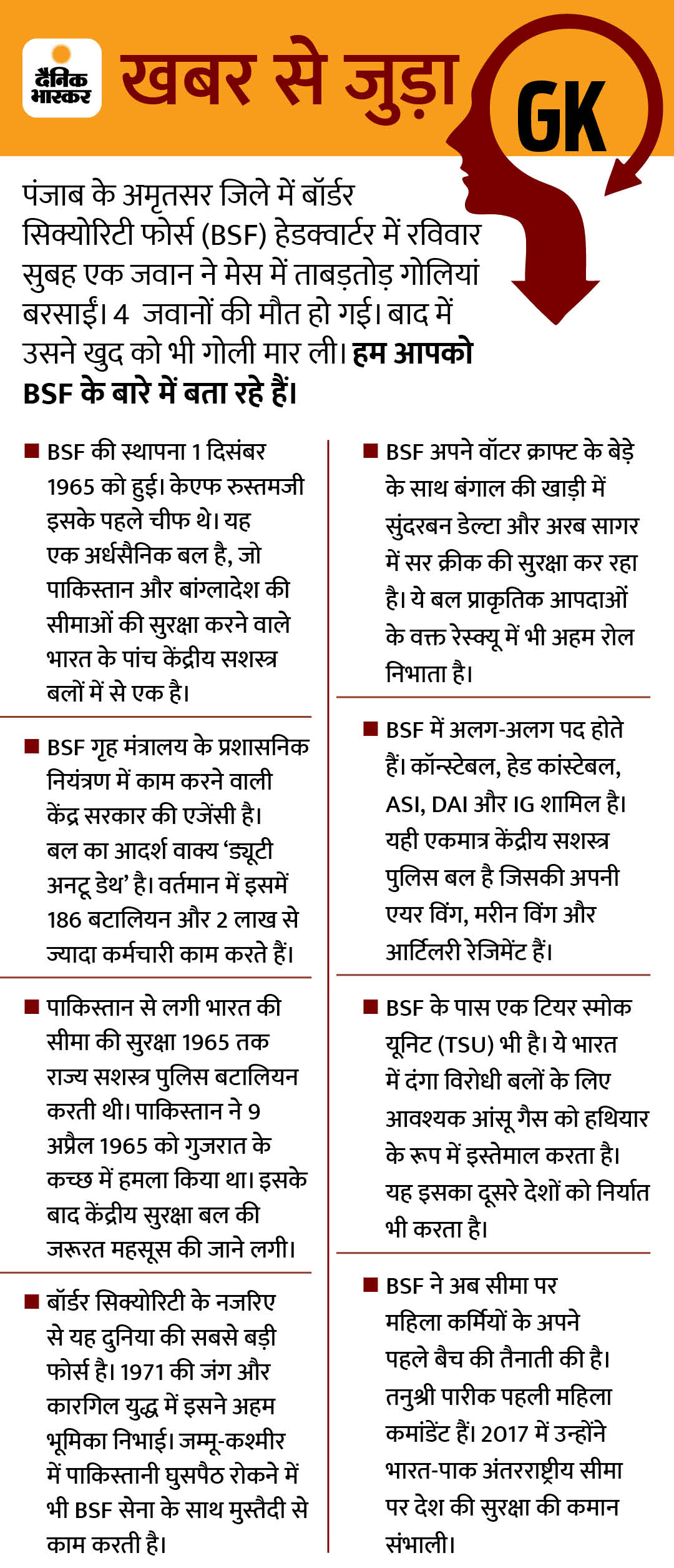 मजीठा/अमृतसर8 घंटे पहलेकॉपी लिंकवीडियोपंजाब के अमृतसर जिले में BSF (बॉर्डर सिक्योरिटी फोर्स) हेडक्वार्टर में रविवार सुबह एक जवान ने मेस में ताबड़तोड़ गोलियां बरसाईं। फायरिंग में 4 जवानों की मौत हो गई है और 1 गंभीर रूप से घायल है। वहीं फायरिंग करने वाले जवान ने बाद में खुद को भी गोली मार ली। अस्पताल ले जाते हुए उसकी भी मौत हो गई। फायरिंग करने वाले जवान की पहचान बटालियन 144 के कॉन्स्टबेल सत्यप्पा एसके के रूप में हुई है। फायरिंग की वजह ड्यूटी का विवाद बताया जा रहा है। मृतक जवानों का पोस्टमार्टम सिविल अस्पताल अमृतसर में चल रहा है।BSF की एंबुलेंस, जिसमें घायलों को लाया गया।मिली जानकारी के अनुसार, खासा स्थित बीएसएफ हेडक्वार्टर की मेस में बटालियन 144 के जवान नाश्ता कर रहे थे। इस दौरान बटालियन 144 के कॉन्स्टेबल सत्यप्पा एसके गुस्से में तमतमाते हुए आया और अंधाधुंध फायरिंग करने लगा। बताया गया है कि सत्यप्पा ड्यूटी को लेकर नाराज चल रहा था। इस घटना से हेडक्वार्टर में हड़कंप मच गया। मेस में गोलियां चलाकर सत्यप्पा ने अपने 4 साथियों को मौत के घाट उतार दिया, जबकि एक जवान राहुल गंभीर घायल हो गया। सत्यप्पा इतने पर भी नहीं रुका। अपनी सर्विस कम्बाइन लेकर मेस से बाहर भागा और लगातार गोलियां चलाता गया।अमृतसर के गुरु नानकदेव अस्पताल में इमरजेंसी वार्ड के बाहर बैठी घायल जवान राहुल की मां उमा देवी।पकड़े जाने के डर से खुद को मार ली गोलीअंत में पकड़े जाने के डर से सत्यप्पा ने खुद को भी गोली मार ली। चार जवानों की मौत घटनास्थल पर ही हो गई, जबकि कॉन्स्टेबल सत्यप्पा और 1 अन्य घायल जवान को आनन-फानन में अस्पताल लाया गया। सत्यप्पा ने रास्ते में ही दम तोड़ दिया। गुरु नानक देव अस्पताल में डॉक्टरों ने उसे मृत घोषित कर दिया। वहीं दूसरे घायल कॉन्स्टेबल का इलाज अभी चल रहा है, लेकिन हालत गंभीर बनी हुई है।अमृतसर के गुरु नानकदेव अस्पताल में इमरजेंसी वार्ड के बाहर तैनात गार्ड।पागलों की तरह गोलियां चला रहा था सत्यप्पाघायल जवान राहुल की मां उमा देवी भी गुरु नानक देव अस्पताल पहुंच गईं। उसके आंसू थम नहीं रहे। उमा देवी ने बताया, ‘सत्यप्पा हर जगह पागलों की तरह फायरिंग कर रहा था। जो भी उसके सामने आया, उसको भूनता गया। मेरे बेटे राहुल को भी गोलियां लग गईं।’ मौके पर मृतक जवानों के परिजन और बीएसएफ के आलाधिकारी पहुंच गए हैं। पुलिस ने भी मौके पर पहुंचकर जांच शुरू कर दी है। फिलहाल बीएसएफ के अधिकारी इस पूरी घटना पर चुप्पी साधे हुए हैं।अमृतसर के गुरुनानक देव अस्पताल में खड़ी BSF की गाड़ी।घायलों का हाल चाल जानने पहुंचे आईजीआईजी बॉर्डर आसिफ जलाल गुरु नानक देव हस्पताल में घायल जवान निहाल सिंह और राहुल का हाल चाल जानने के लिए पहुंचे। इस दौरा