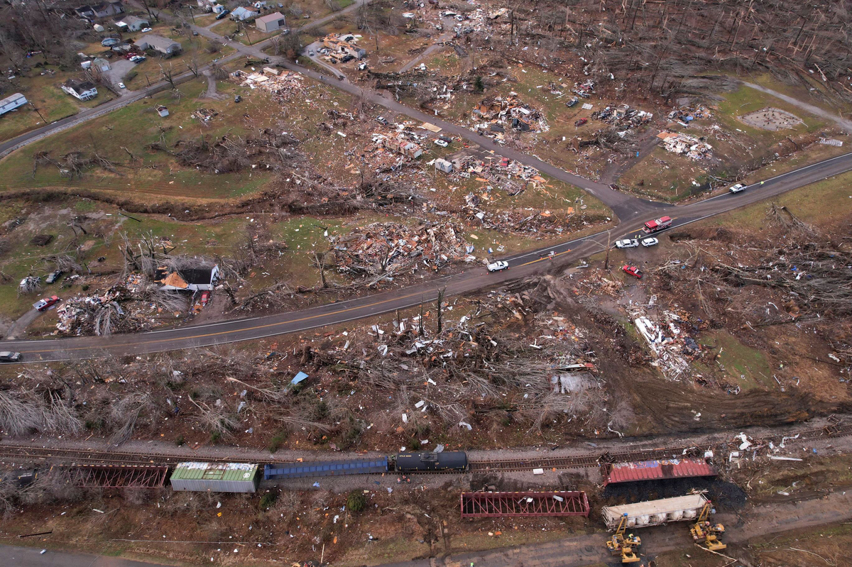 People work at the scene of a train derailment after a devastating outbreak of tornadoes in Earlington, Ky.