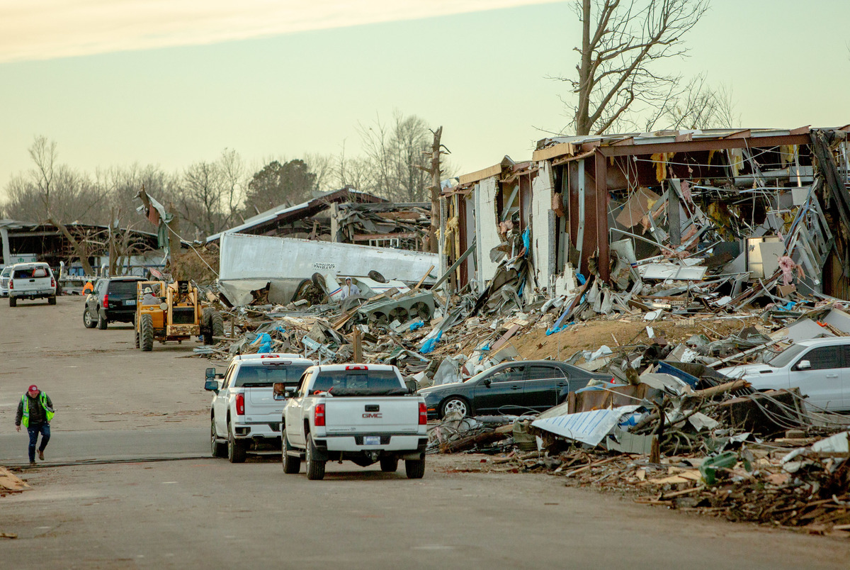 General view of tornado damaged structures in Mayfield, Kentucky.