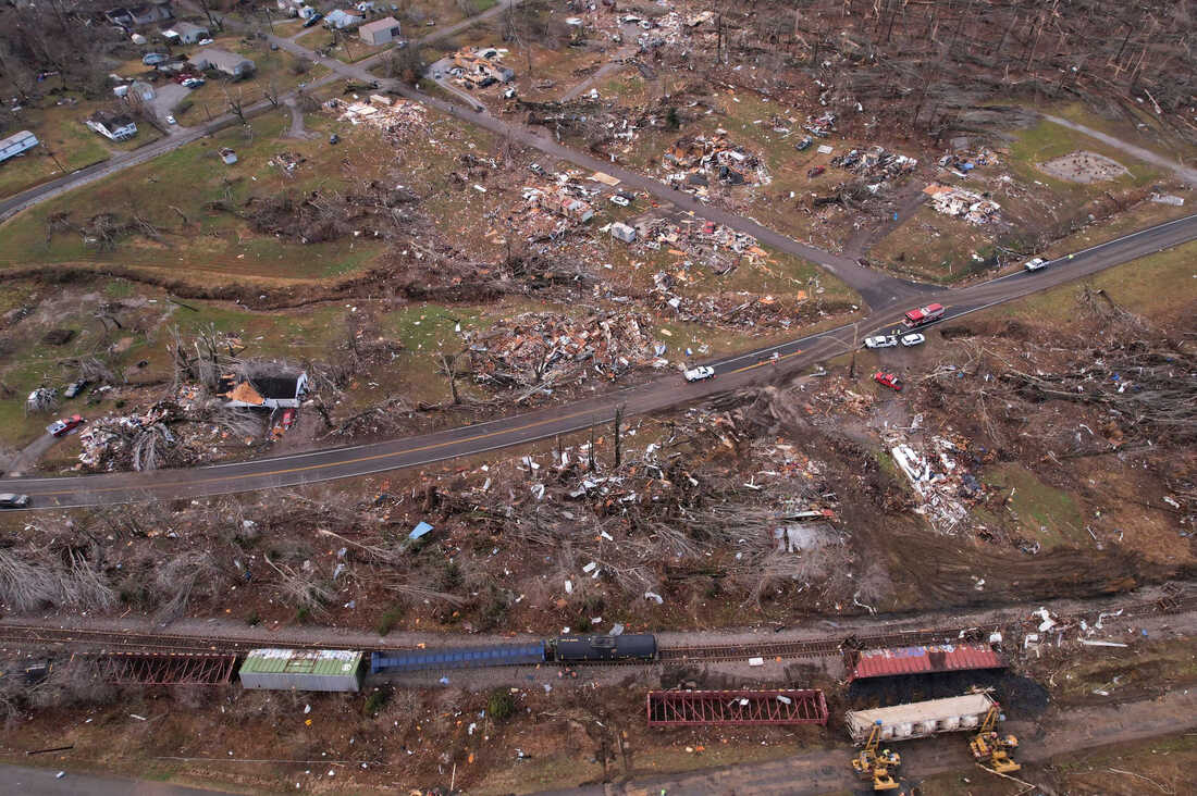People work at the scene of a train derailment after a devastating outbreak of tornadoes in Earlington, Ky.