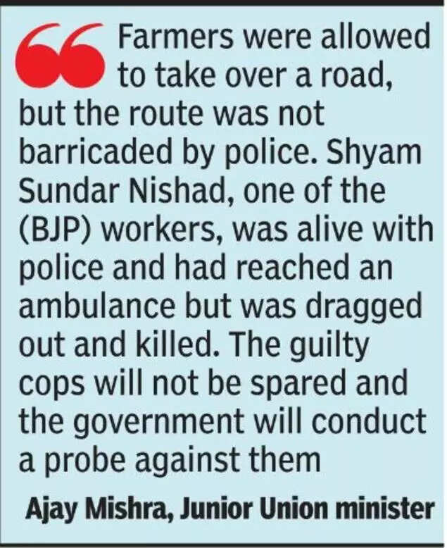 BAREILLY: Junior Union home minister Ajay Mishra said on Sunday at a prayer meeting in Singha Khurd village for three BJP workers who had died during the Lakhimpur Kheri violence that “the death of the three men is unfortunate and the way the incident took place in the presence of officials shows the negligence of both police and the administration”. Mishra, who is himself an accused in an FIR registered by farmers, added, “Farmers were allowed to take over a road and then the route was not barricaded by police. Shyam Sundar Nishad, one of the workers, was alive with police and had reached an ambulance but was dragged out and killed. The guilty cops will not be spared and the government will conduct a probe against them. The government has given a free hand to the investigating agency”. The Thar jeep (the first vehicle in the killer convoy) was registered in the minister’s name. His son Ashish, a key accused, is already under arrest and is being interrogated. In all, six men have been arrested till now in the case. Shyam Sundar’s brother Sanjeev Nishad, meanwhile, said, “I am happy that the minister has raised the issue of my brother’s death in police custody. I am sure the accused will be held soon and action will be taken against the policemen.” When asked about the minister’s claims, Lakhimpur Kheri SP Vijay Dhull said, “I am not aware if any such allegation was levelled. The investigation of this case is with SIT and I can’t comment on it.” A senior cop, who was deployed for the security arrangements on the day of the clashes, said, “We had barricaded the road from both sides and provided protesters a different route. But the convoy passed through the barricades at a very high speed. Policemen signalled them to slow down. A normal person doesn’t drive so fast in a busy market. There were many farmers on the road. Barricades are normally set up for vehicles to slow down, but (in this case) the convoy didn’t pay heed.” TOI tried to contact Ajay Mishra for his comments, but he didn’t respond to calls. Incidentally, soon after the violence, protesting farmers had claimed that Shyam Sundar was beaten up and handed over to police “alive”. They had also released photos to support the claim. A farmer, who was at the protest that day, had told TOI, “He was not critical. We have a photo in which he is walking with the police after we handed him over.” This came even as three co-accused in the matter were sent back to jail on Sunday. They are now under judicial custody following the three-day police remand. The accused, including Ashish, have been kept in separate barracks, jailer Pankaj Singh said. In another development, in a video message released by police on Sunday, Amandeep Singh Sandhu, Lakhimpur Kheri district president, Bhartiya Kisan Union (Tikait), said that Samyukta Kisan Morcha’s ‘Rail roko’ protest scheduled on October 18 has been called off in Kheri district after a meeting of the senior members.