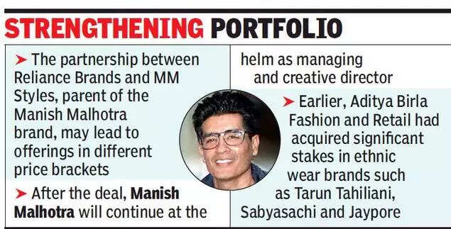 NEW DELHI: Reliance Brands, part of the Mukesh Ambani-led Reliance Industries, has picked up 40% stake in Manish Malhotra, the Indian couture brand widely favoured by well-heeled Bollywood celebrities.