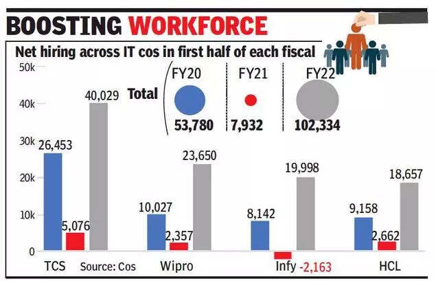 BENGALURU: India’s four biggest IT firms — TCS, Infosys, Wipro and HCL — have seen their combined employee strength rise by over 1 lakh in the first six months of the fiscal year. That’s 13 times more than in the corresponding period of the previous year, after the pandemic had struck. And it’s almost twice that in the corresponding period of the pre-pandemic year, 2019-20.